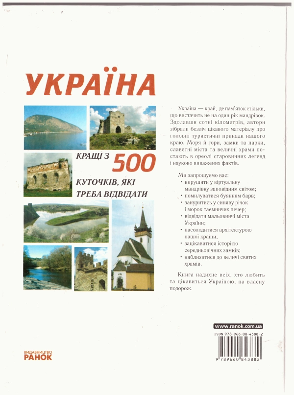 Україна—край, де пам’яток стільки, що вистачить не на один рік мандрівок. Здолавши сотні кілометрів, автори зібрали безліч цікавого матеріалу про головні туристичні принади нашого краю. Моря й гори, замки та парки, славетні міста та величні храми постають в ореолі старовинних легенд і науково виважених фактів. Книга запрошує вас вирушити у віртуальну подорож заповідним світом, помилуватися буянням барв, зануритись у синяву річок й морок таємничих печер. Від усієї цієї краси навіть у завзятого мандрівника перехопить подих. А початківця книга напевно надихне на власну подорож.