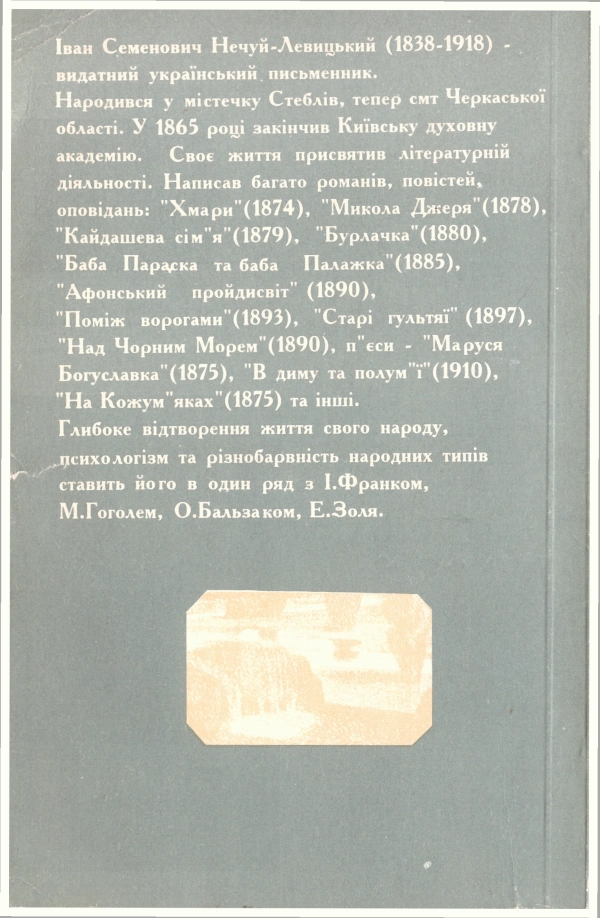 Відомості про видання: Надруковано за виданням І. С. Нечуй-Левицький «Вибрані твори» Держлітвидав України, Київ, 1960 р.Вихідні дані: Київ : МПП «Анфас», 1994Опис: 162 с. : іл. ; 199 мм.Мова: українська.Країна: Україна.ISBN: 5-7707-4192-9.УДК: 82-3.161.2