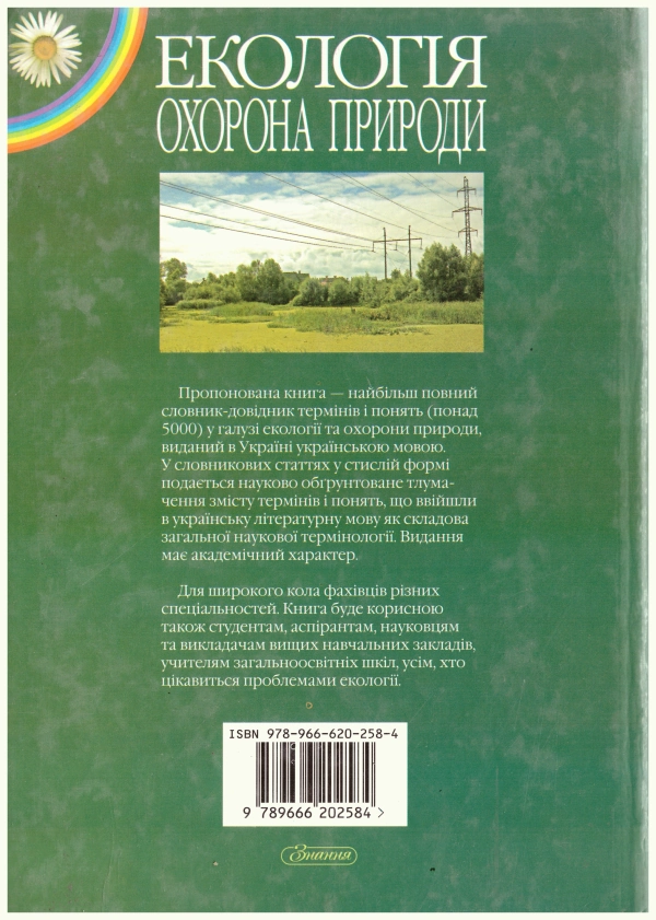 Пропонована книга — найбільш повний словник-довідник термінів і понять (понад 5000) у галузі екології та охорони природи, виданий в Україні українською мовою. У словникових статтях у стислій формі подається науково обґрунтоване тлумачення змісту термінів і понять, що ввійшли в українську літературну мову як складова загальної наукової термінології. Видання має академічний характер.