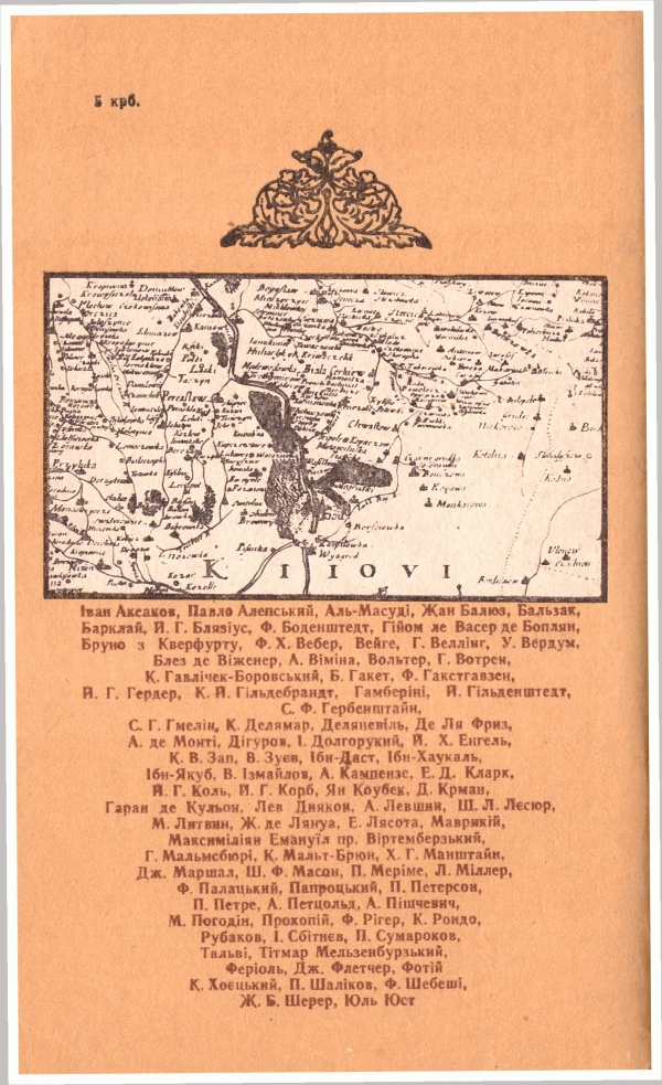 I. Найстарші відомосте про Україну. Арабські письменники X ст.: Ібн-Даст, Аль-Масуді, Ібн-Хаукаль, Ібн-Якуб. Грецькі, візантійські джерела VI—X ст.: Прокопій, Маврикій, патріярх Фотій, Лев Диякон. Західньо-европейські подорожники XI—XIV ст.: Бруно з Кверфурту, Тітмар Мерзебургський, Жільбер де-Лянуа, лист Альберта Кампензе, Записки С. Герберштайна, Дневники Михайла Литвина і Блез де Віженера про природні багацтва України 5
