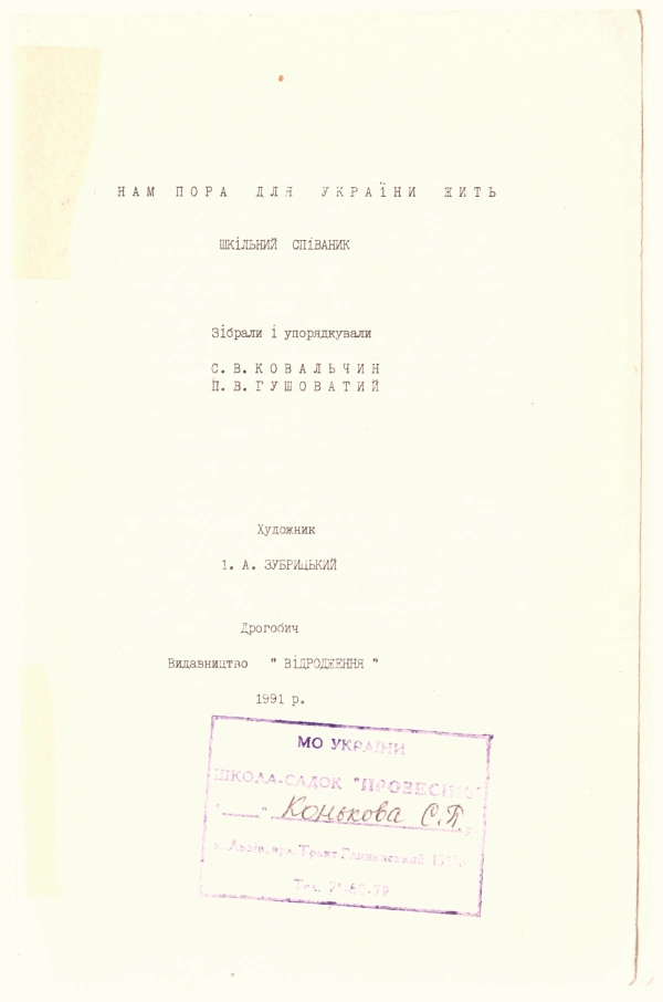 Нам пора для України жить [Текст] : Шкільний співаник / Зібрали і упорядкували С. В. Ковальчин, П. В. Гушоватий ; художник І. А. Зубрицький