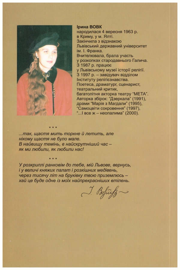 Нова книжка сучасної української поетеси, що мешкає у Львові, — своєрідний підсумок її двадцятип'ятирічної літературної діяльності. Пропоновані читачеві поезії позначені глибоким змістом, витонченою стилістикою, досконалим відчуттям філософії життя.