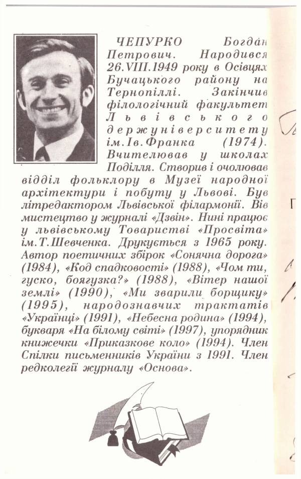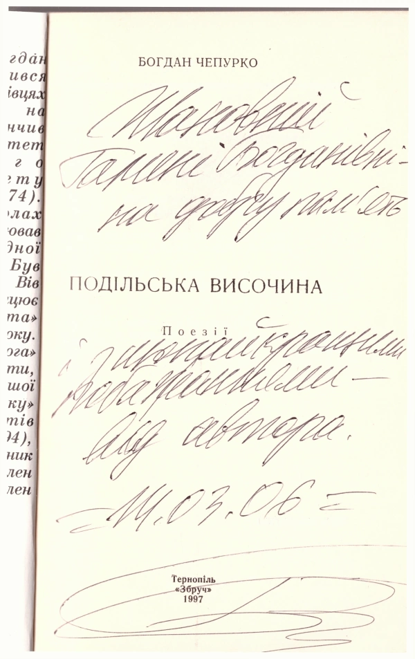 25451 Чепурко Б. Шановній Галині Богданівні — на добру пам'ять і найкращими побажаннями від автора. 14.03.06