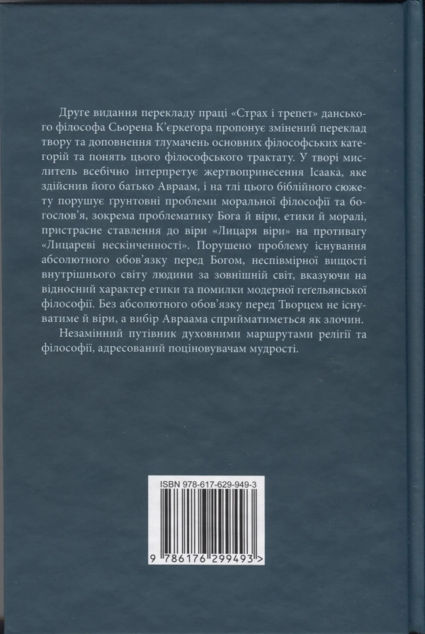 Друге видання перекладу праці «Страх і трепет» данського філософа Сьорена К’єркеґора пропонує змінений переклад твору та доповнення тлумачень основних філософських категорій та понять цього філософського трактату. У творі мислитель всебічно інтерпретує жертвопринесення Ісаака, яке здійснив його батько Авраам, і на тлі цього біблійного сюжету порушує ґрунтовні проблеми моральної філософії та богослов’я, зокрема проблематику Бога й віри, етики й моралі, пристрасне ставлення до віри «Лицаря віри» на противагу «Лицареві нескінченності». Порушено проблему існування абсолютного обов’язку перед Богом, неспівмірної вищості внутрішнього світу людини за зовнішній світ, вказуючи на відносний характер етики та помилки модерної геґельянської філософії. Без абсолютного обов’язку перед Творцем не існуватиме й віри, а вибір Авраама сприйматиметься як злочин.
